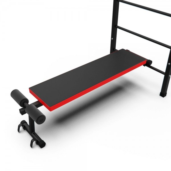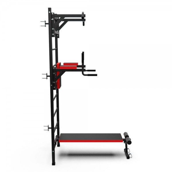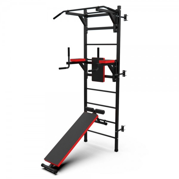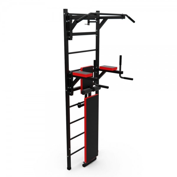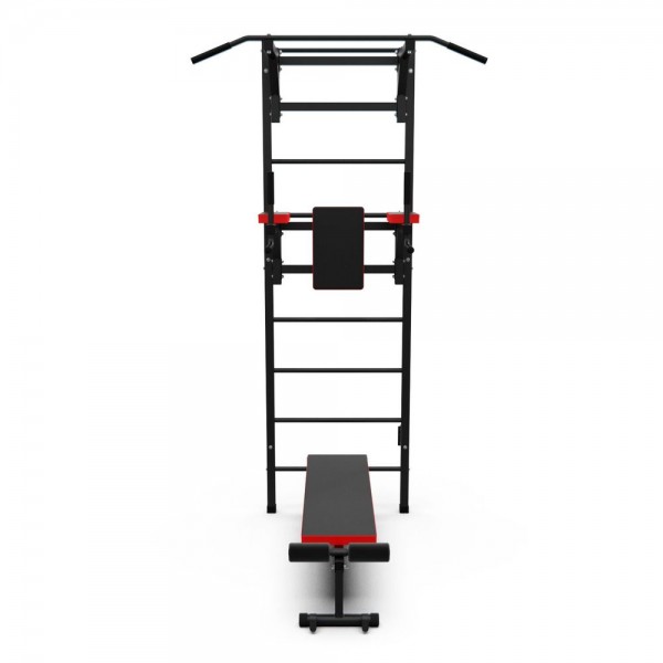 DFC VT-6006 - шведская стенка в средней комплектации, с максимальным набором опций. Кроме брусьев и турника здесь есть скамья для различных силовых упражнений.