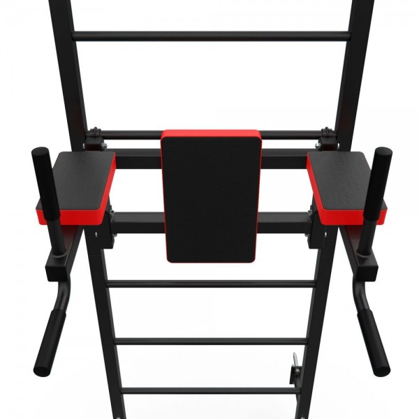 Конструкция включает турник шириной 99 см с комфортными неопреновыми ручками. Его можно быстро перевесить по перекладинам стенки на нужную высоту. Вынос турника составляет 72 см, а брусьев - 87 см. Есть удобные подлокотники и валики.