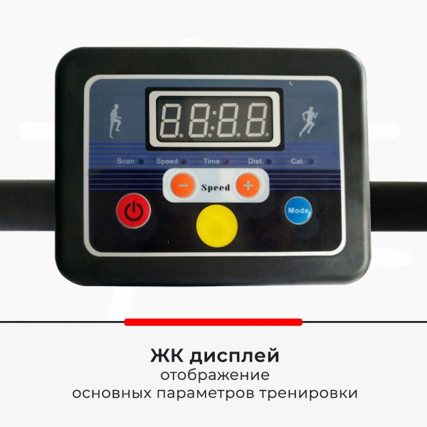 Конструкция модели включает прочную деку и двигатель на 1 л.с., скорость движения от 1 до 6 км/ч (с шагом 0,1). Для надежного хвата установлены длинные поручни с прорезиненной поверхностью. Пуск движения возможен с полотна. Если требуется проверять работу сердца, необходим кардиопояс и часы-монитор (например DFC W117). Есть ролики для перемещения.
