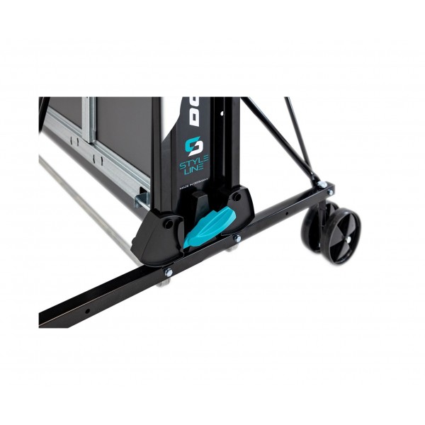Меламиновая столешница установлена на раму из трубы диаметром 36 мм. Стол можно передвинуть благодаря прорезиненным двойным роликами (125 мм диаметр). Для комфорта игроков предусмотрен держатель для ракеток и шариков. Стол легко складывается.