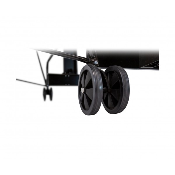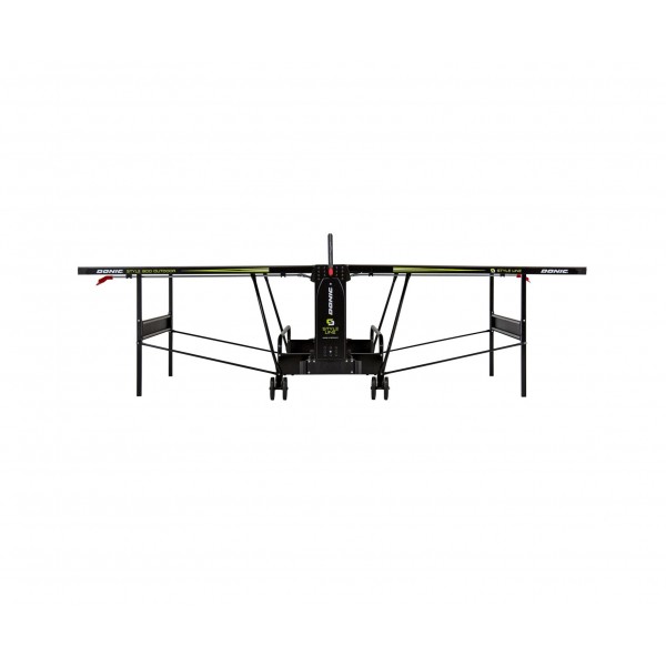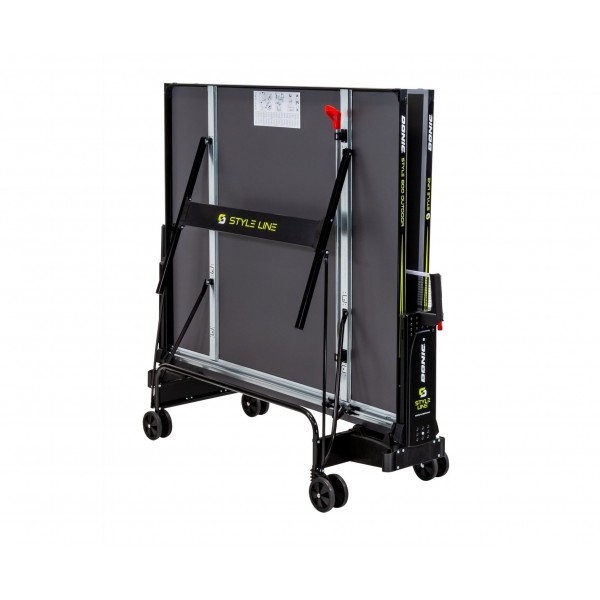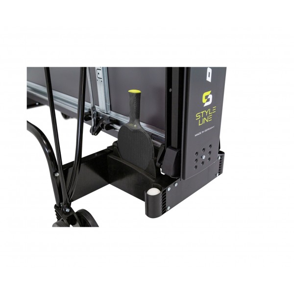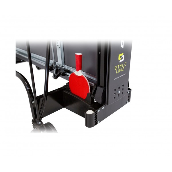 Меламиновая столешница 5 мм установлена на раму из трубы диаметром 36 мм. Стол можно передвинуть благодаря прорезиненным двойным роликами (128 мм диаметр). Для комфорта игроков предусмотрен держатель для ракеток и шариков. Стол легко складывается, есть регулировка высоты.