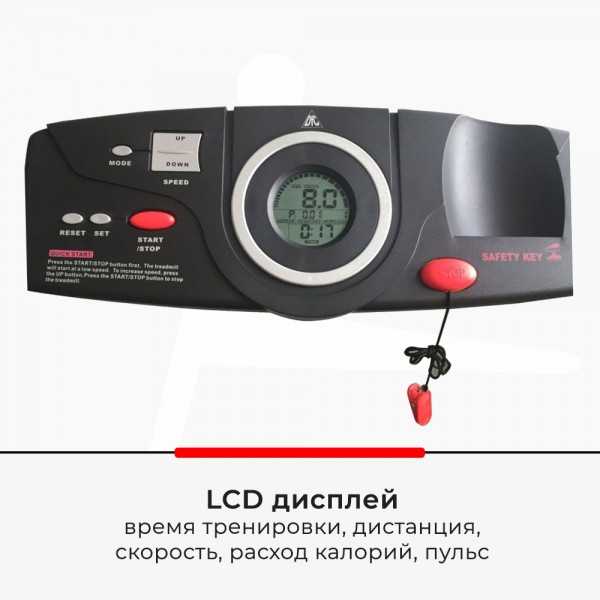 Для безопасности установлены удлиненные поручни и. специальный ключ, чтобы пользователь мог сразу выключить тренажер (крепится на одежду). Включить тренажер можно уже с пользователем на полотне.