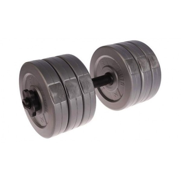 Гантель виниловая оснащена замком-гайкой Вейдера. Рукоять имеет противосользящую насечку (диаметр 25,4 мм). В комплект входит гриф весом 0,22 кг, а также шесть дисков по 2,5 кг.