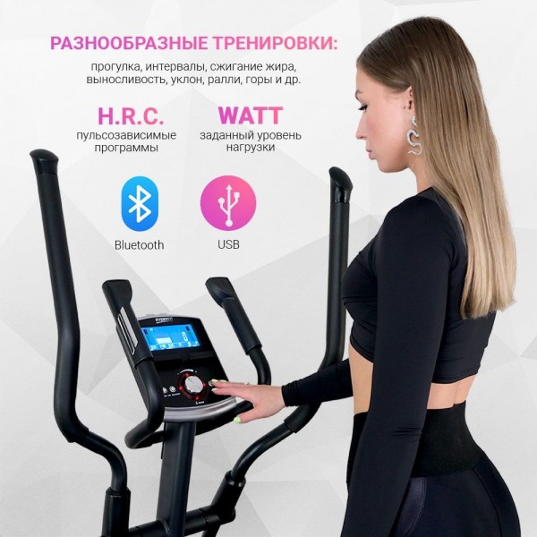 На дисплее можно наблюдать параметры тренировки. Есть USB и Bluetooth. Среди 24 программ: