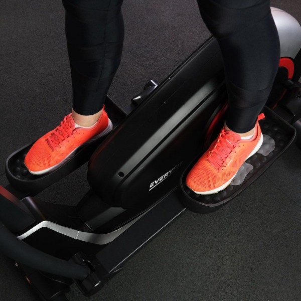 В модели работает маховик весом 21 кг (инерционный), предусмотрена точная настройку нагрузка в Ваттах. Длина шага эллипсоида составляет 36 см. На поручнях встроены датчики пульса, а педали выполнены из нескользящего материала.