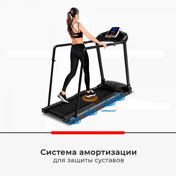 Двигатель на 1,5 л. с. позволяет ходьбу на скорости от 0,3 до 6 км/ч. Полотно модели имеет толщину 16 мм и оборудовано восьмью эластомерами SoftSeparate™, что уменьшает нагрузку на суставы во время движения. Регулировать скорость можно как на консоли, так и на поручнях.