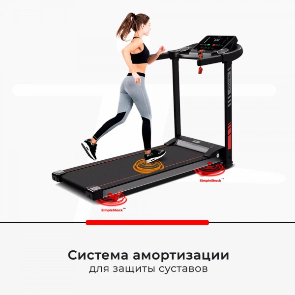 Тренажер имеет ширину полотна 40 см и способен развить скорость до 12 км/ч. Дополнительное увеличение наклона (3 варианта) позволит усилить нагрузку на спортсмена. Установлены амортизаторы полотна для снижения воздействия на суставы. Конструкция рассчитана на вес до 100 кг. Проверка пульса не предусмотрена.