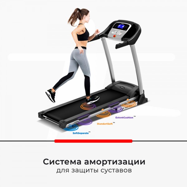 Двигатель на 2 л. с. разгоняет дорожку до 14 км/ч. Тренажер основан на усиленной раме. Амортизация включает два элемента SoftSeparate™ на корме, четыре удлиненных элемента ExtentCushion™ и четыре StandartSoft™ в основной зоне полотна.