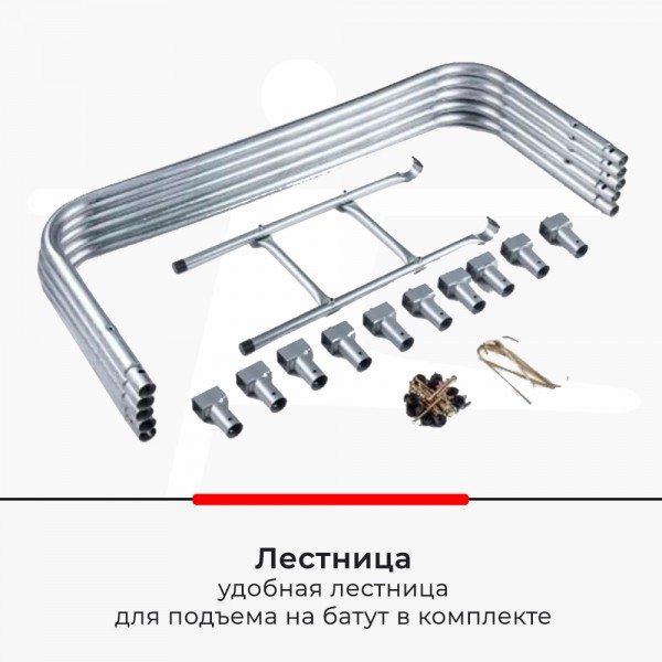 В основе батута стальной каркас с двусторонней оцинковкой и усиленными стальными опорами на болтах из закаленной стали. Пружины имеют антикоррозийную обработку и оригинальный зацеп, исключающий случайное отсоединение. Прыжковая поверхность из современного материала (технология Permatron) обладает повышенной влаго- и светостойкостью. Предусмотрен защитный мат для пружинного блока и защитная сеть со входом на дополнительных фиксаторах, а также специальные мягкие чехлы для стоек сетки.