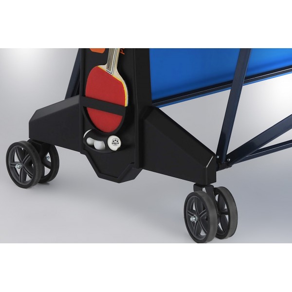 Система складывания включает фиксирующие элементы для удержания стола в сложенном виде. Высоту опор можно менять, есть ролики для транспортировки. Отличный отскок мячика гарантирует профессиональная столешница. Стол оснащен встроенной сеткой с натяжным устройством.
