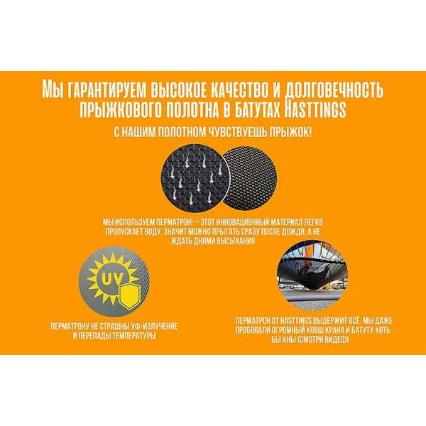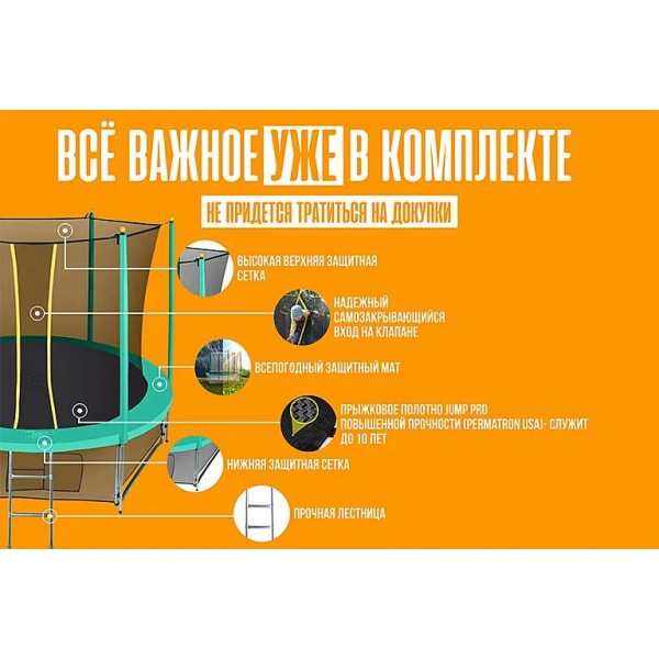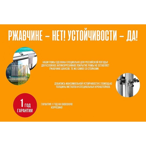 Конструкция основывается на прочной раме из стальной трубы с двухслойным антикоррозийным покрытием (статическая нагрузка до 500 кг). Батут предлагает: