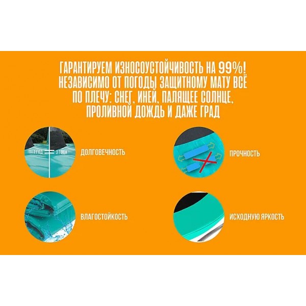 | Защитный мат | армированный ПВХ устойчивый к УФ-излучению, наполнитель - увеличенный слой EPE-пены, он не токсичен, устойчив к перепадам температур и влажности |