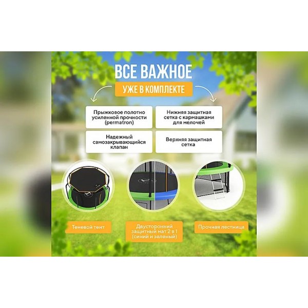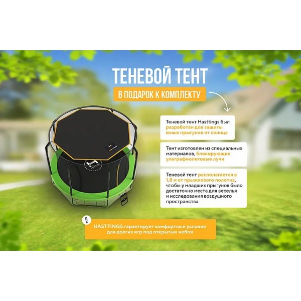 Батут Hasttings Sky MAX предлагает двусторонний мат и защиту от яркого солнца (тент), что делает его идеальным вариантом для летнего активного отдыха.
