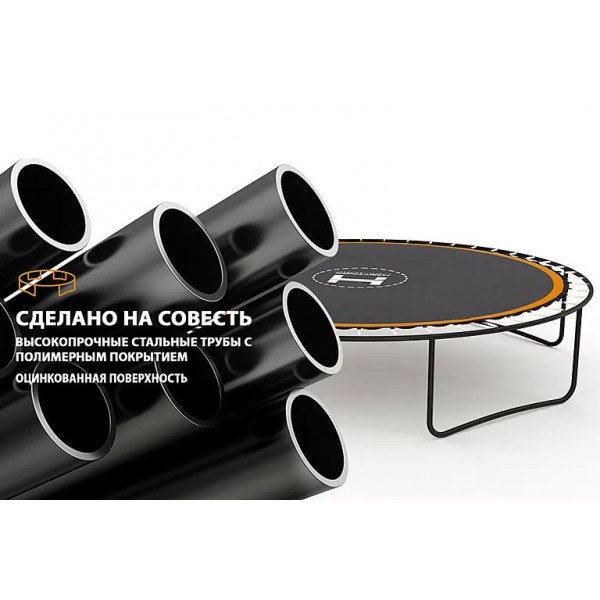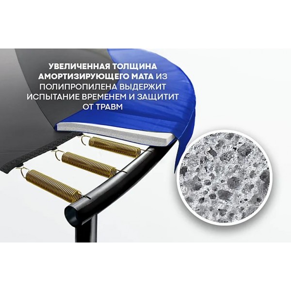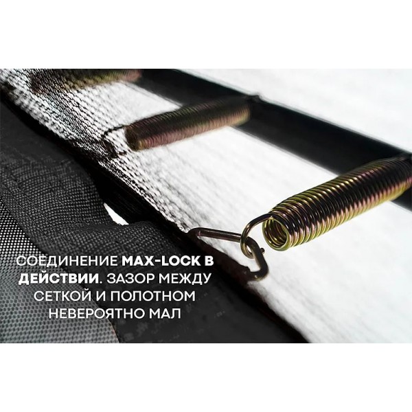 Рама конструкции защищена от ржавчины двойной оцинковкой и порошковым окрашиванием. Крепление сетки Max-Lock обеспечивает безопасность, исключая попадание человека в щель за прыжковым полотном. Батут предлагает: