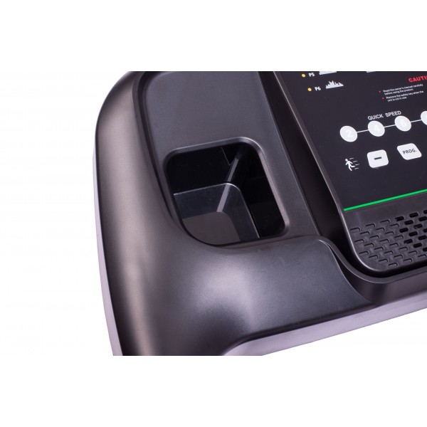 Для компактного хранения полотно дорожки можно поднять. На тренажере можно разместить дополнительные аксессуары на подставках.