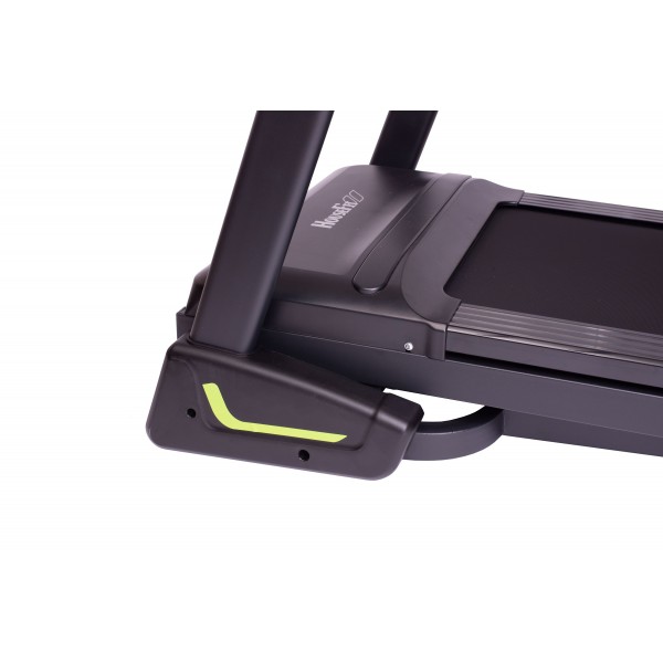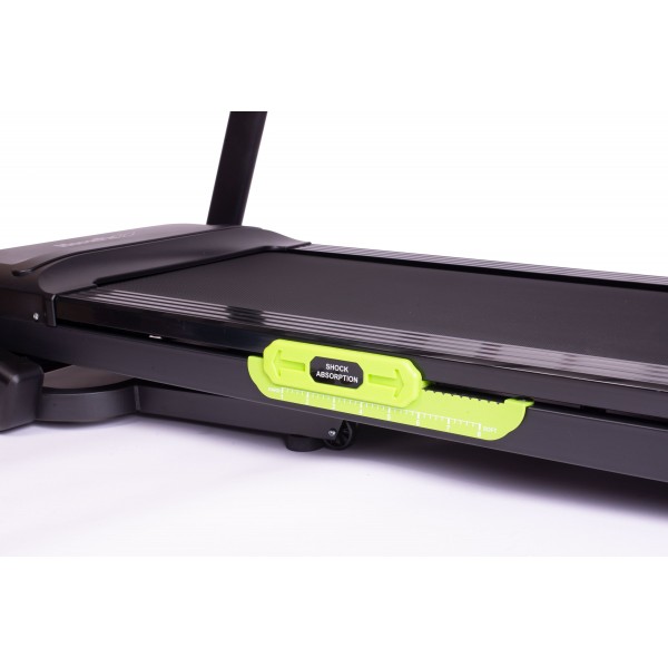 Двигатель на 2,5 л.с. позволяет спортсмену тренироваться на скорости до 16 км/ч. Увеличение наклона (до 15%) дополнительно повышает нагрузку. Система встроенной амортизации настраиваемая, установлена для уменьшения воздействия ударной силы на суставы. Чтобы следить за работой сердца, необходимо касаться датчиков на поручнях.