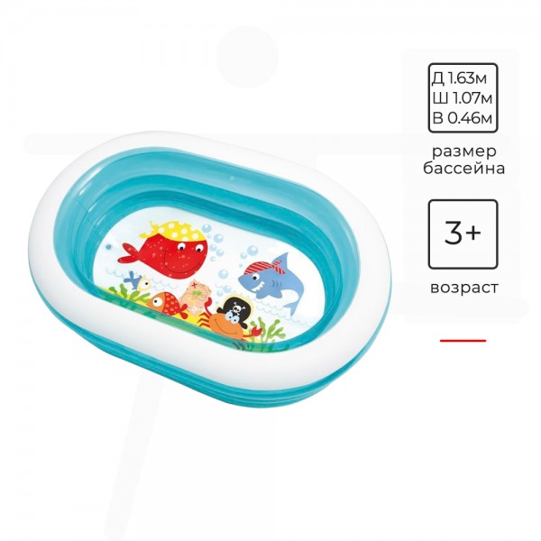 Модель имеет прозрачные стенки и яркий дизайн. Надувные бортики обеспечивают комфорт и безопасность детей. Бассейн легко надуть и очистить.