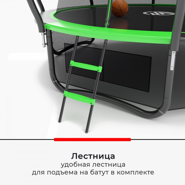 Батут оснащен внутренней сеткой для защиты от падения, а также нижней сетью с местом для хранения обуви или игрушек. Установлено кольцо для игры в баскетбол, прилагается и мяч с ручным насосом. В комплект поставки входит лестница.