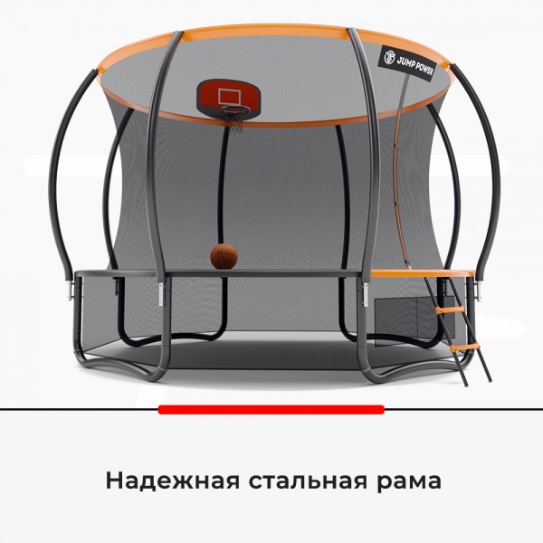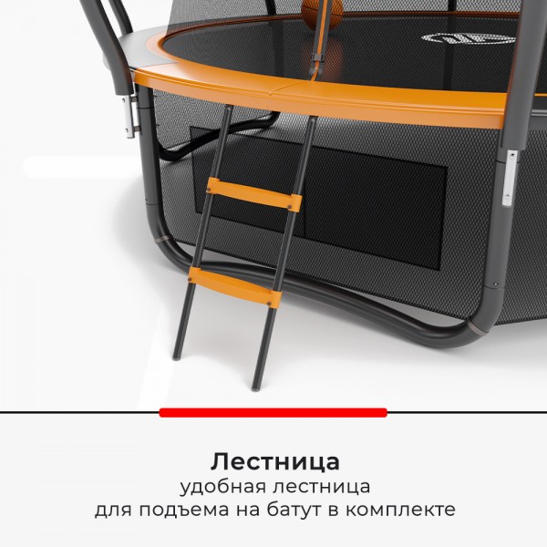 Батут оснащен внутренней сеткой для защиты от падения, а также нижней сетью с местом для хранения обуви или игрушек. Установлено кольцо для игры в баскетбол, прилагается и мяч с ручным насосом. В комплект поставки входит лестница.
