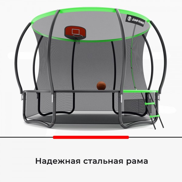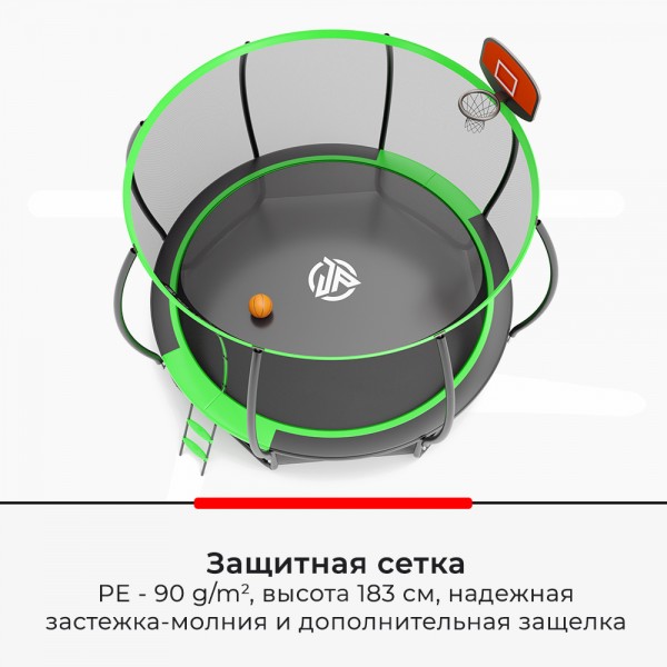 Батут оснащен внутренней сеткой для защиты от падения, а также нижней сетью с местом для хранения обуви или игрушек. Установлено кольцо для игры в баскетбол, прилагается и мяч с ручным насосом. В комплект поставки входит лестница.