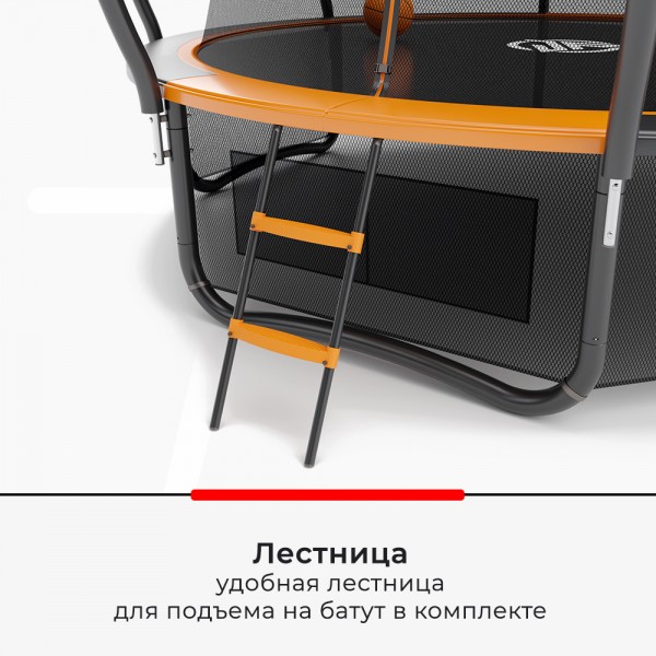 Батут оснащен внутренней сеткой для защиты от падения, а также нижней сетью с местом для хранения обуви или игрушек. Установлено кольцо для игры в баскетбол, прилагается и мяч с ручным насосом. В комплект поставки входит лестница.