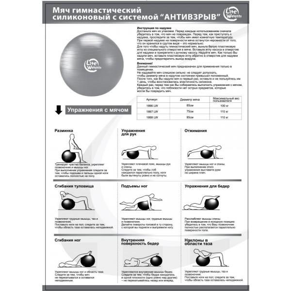 Мяч Lite Weights 1868LW выполнен по технологии "анти-взрыв", комплектуется ручным насосом.