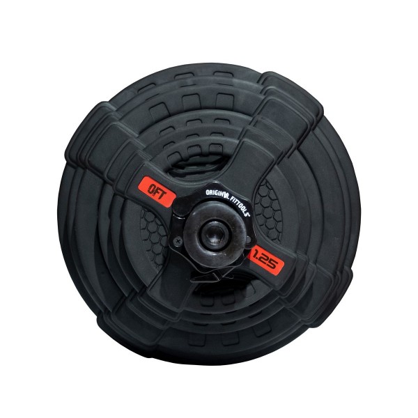 Штанга Original FitTools FT-2HGSET-128-BLACK представляет собой комплект из черного грифа с замками и 12 дисками. Вес 128 кг.