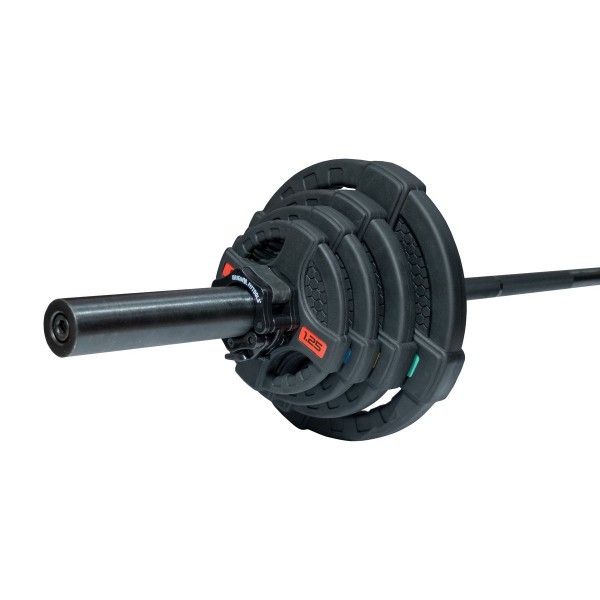 Штанга Original FitTools FT-2HGSET-58-BLACK представляет собой комплект из черного грифа с замками и 8 дисками. Вес 58 кг.