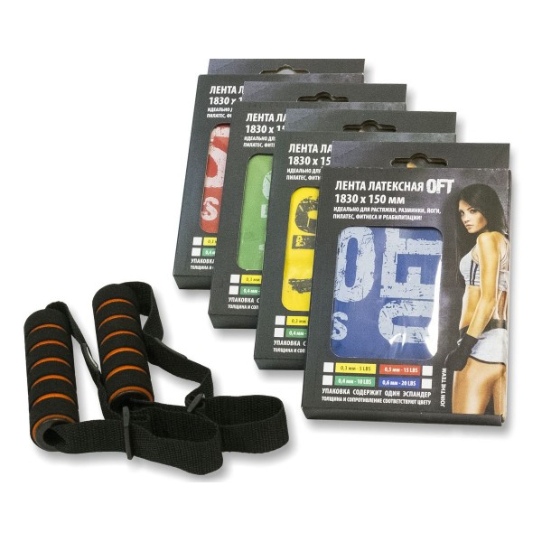 Комплект Original FitTools FT-LBND-1830-SET состоит из 4х эластичных лент (фитнес-резинка) разной нагрузки шириной по 15 см.