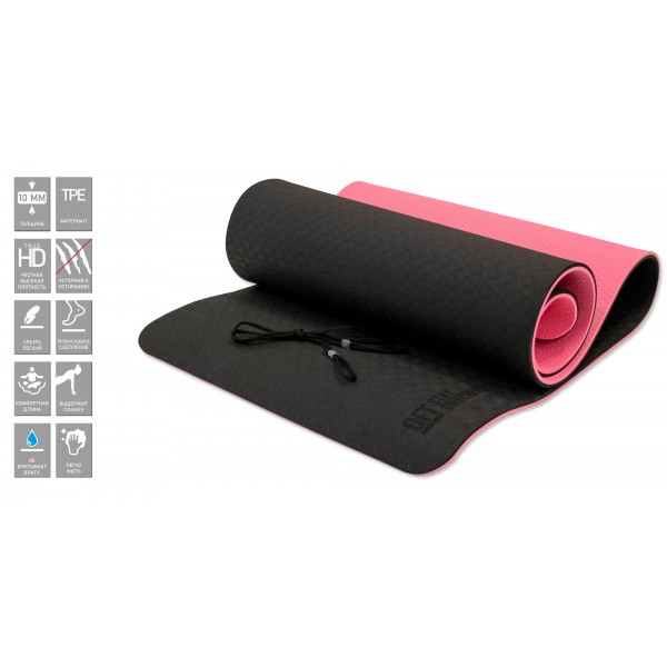 Коврик Original FitTools FT-YGM10-TPE-BPNK имеет толщину 10 мм и комфортную длину полотна. Материал TPE устойчив к истиранию и легко очищается.