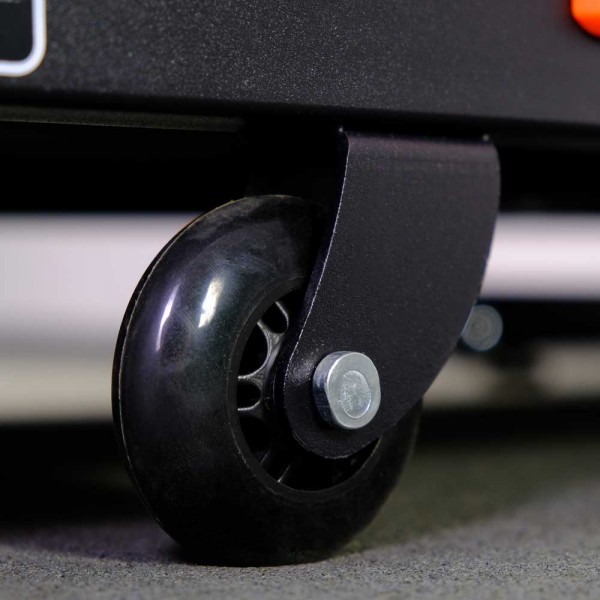 Модель имеет ролики для быстрого перемещения и компенсаторы неровности, а также подставки для аксессуаров.