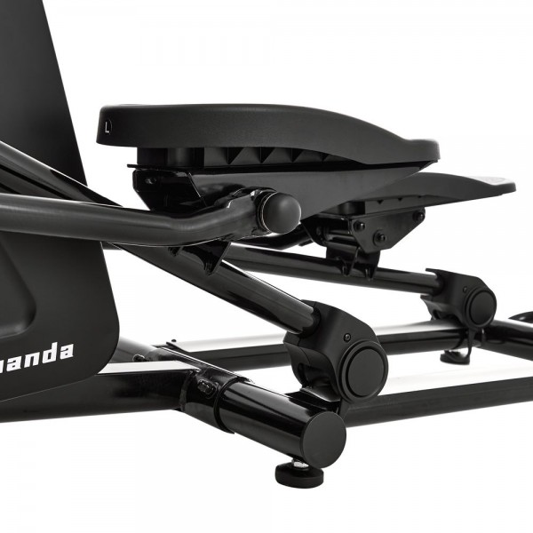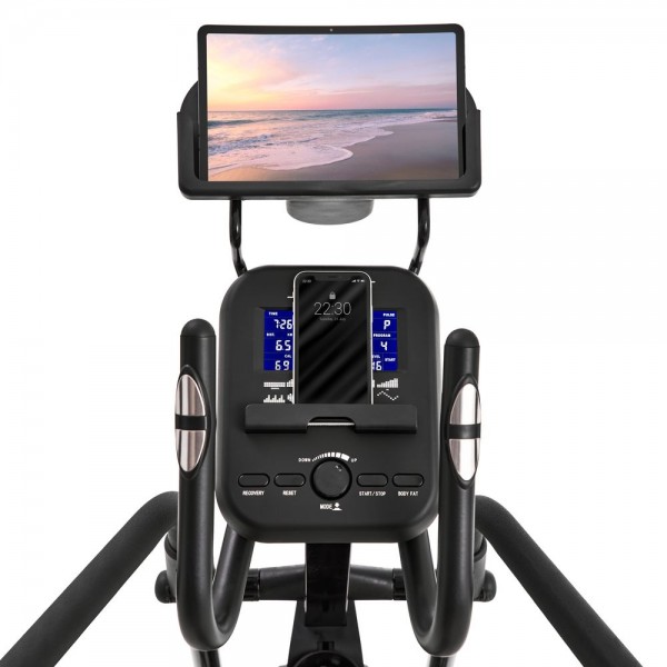 Особенностью конструкции является установка подшипников во всех узлах сочленений тренажера. Маховик на 17 кг обеспечивает 32 уровня нагрузки, которые можно настроить на консоли. Кроме длины шага 50 см, стоит отметить небольшой Q-фактор - всего 10 см. Есть возможность проверки пульса через датчики на удобных поручнях.