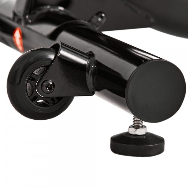 Тренажер оснащен роликами и компенсаторами неровности, есть подставки для фиксации бутылки и планшета.