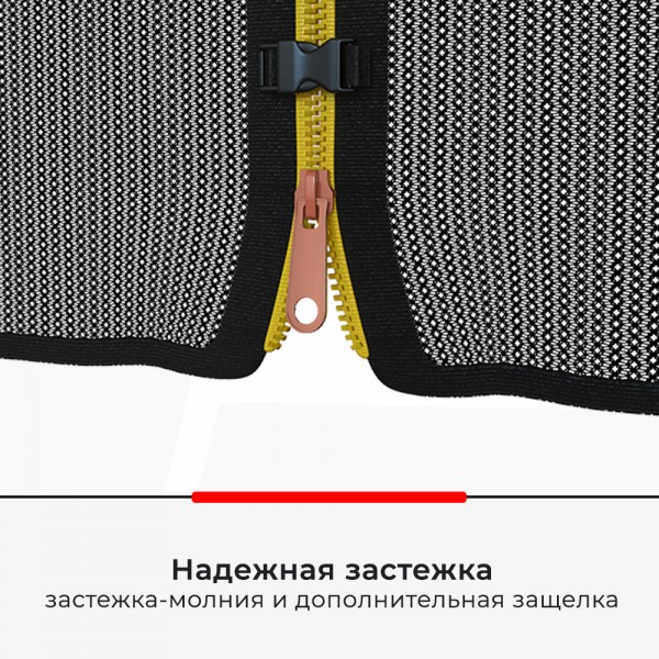 Батут использует собственную систему крепления, что повышает надежность основания. Ограничивающая сеть выполнена из лавсана с внутренним креплением. Вход с дополнительным фиксатором молнии гарантирует безопасность детей. Т-коннектор стоек позволяет максимально натянуть сеть батута без провисаний. Пружины бочкообразной формы изготавливаются с покрытием обеспечивающим им защиту от коррозии. Прыжковое полотно из Перматрона - надежного и хорошо зарекомендовавшего себя материала.