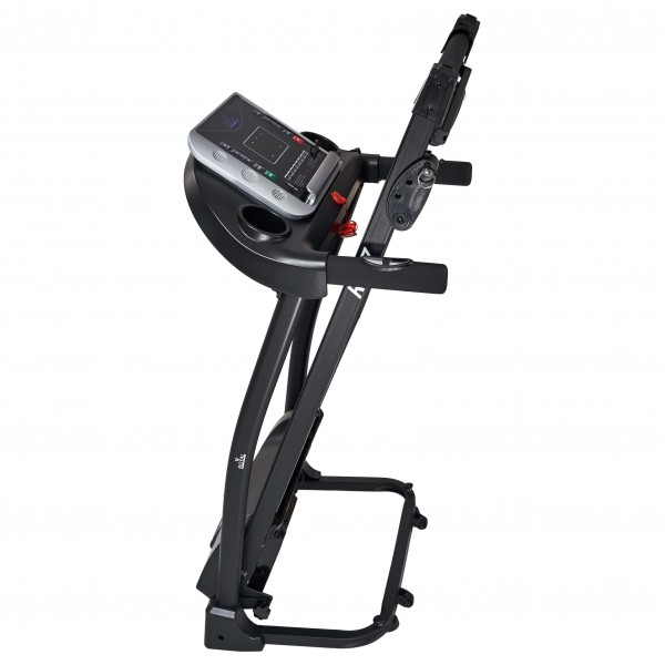 Мотор американского бренда Leeson обеспечивает скорость движения до 10 км/ч. Прочная дека сочетается с многозонной амортизацией. Можно выбрать три варианта наклона, выставляя его вручную. Параметры беговой области будут удобны при среднем росте спортсмена. На поручнях стоят датчики, касаясь которых можно узнать частоту пульса. Дорожка оборудована механизмом сложения на основе гидравлики, что гарантирует безопасность использования.