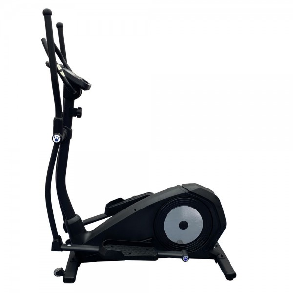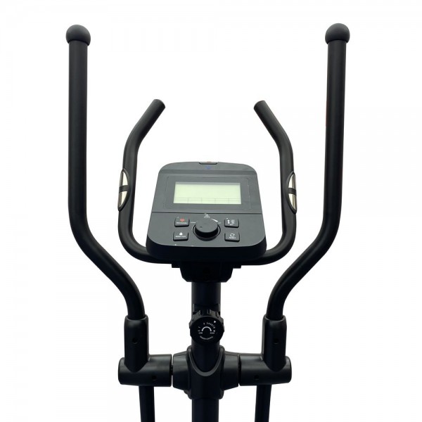 Нагрузка обеспечивает маховиком весом 16 кг, можно выбрать 8 уровней. Для изменения сопротивления используется специальный переключатель на центральной стойке орбитрека. Предусмотрена проверка пульса через датчики на поручнях. Длины шага в 40 см будет достаточно пользователям среднего роста. Q-фактор модели составляет 21 см