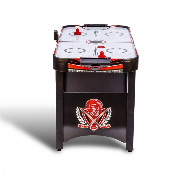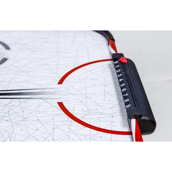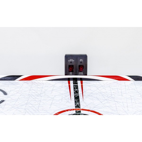 Стол оснащен механическим и электронным устройством для подсчета очков. Две биты и шайбы в комплекте.