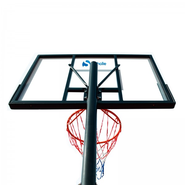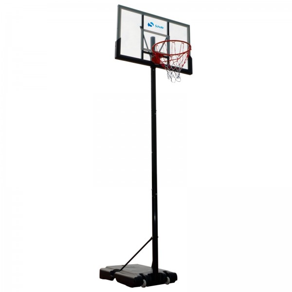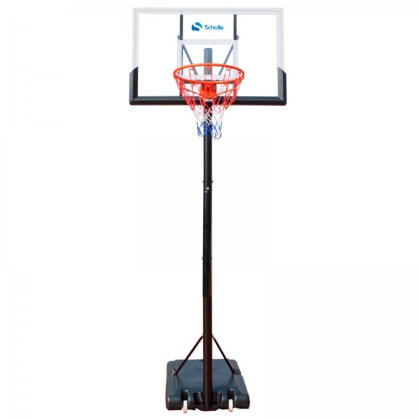 Scholle S003-26 - мобильная баскетбольная стойка с регулировкой высоты кольца 1,5-3,05 м. Может использоваться на улице или в зале. Кольцо выполнено с усиленным ободом и амортизаторами, а также всепогодной сеткой. Диаметр каркаса из металла 6,6 см. Для устойчивости основание наполняется водой или песком (объем на 65 кг). Модель имеет ролики для легкого перемещения.