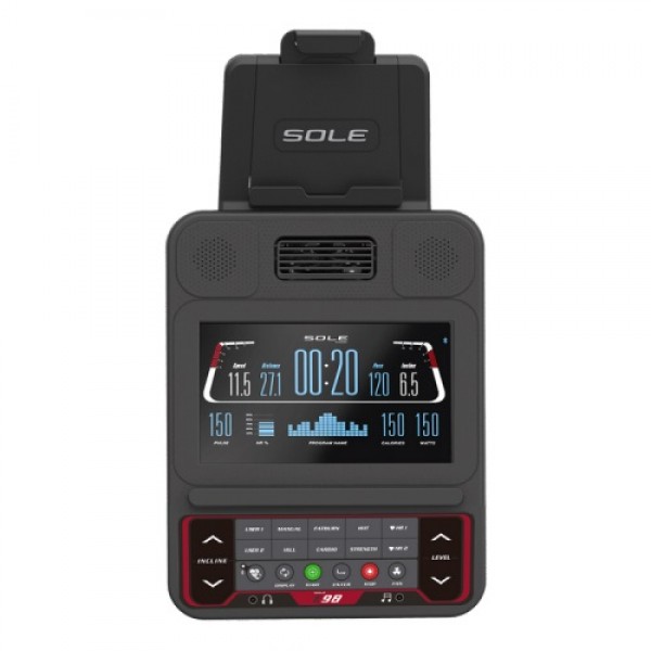 Консоль выполнена с 10-ти дюймовым TFT монитором, встроенным вентилятором и аудиосистемой. По Bluetooth соединению тренажер можно синхронизировать с фирменным бесплатным мобильным приложением или к Apple Health, Fitbit и др. Среди предлагаемых встроенных программ: