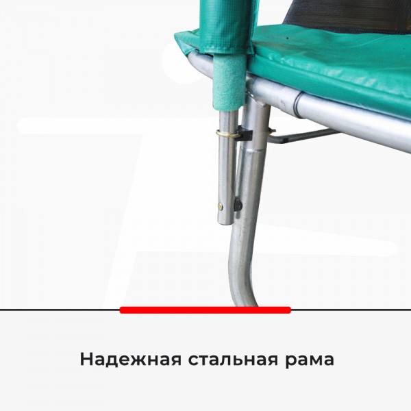 Прочный металлический каркас батута включает 3 опоры, для дополнительного крепления сетки используются Т-коннекторы. По верхнему краю сетки используется гибкая фиберглассовая окантовка.