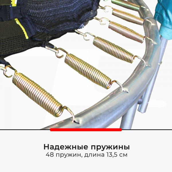 Защитная сетка фиксируется на край прыжкового полотна, что защищает прыгуна от падения на пружины. Батут комплектуется лестницей и защитным чехлом, который распространяется на всю раму с пружинами. Вход имеет застежку-молнию с замком безопасности. Из-за низкой высоты лестница не требуется.