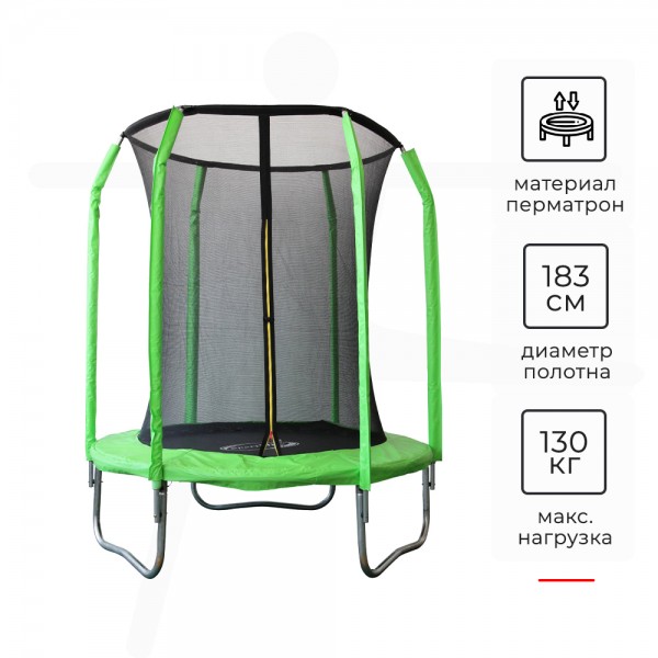 Защитная сетка фиксируется на край прыжкового полотна, что защищает прыгуна от падения на пружины. Батут комплектуется защитным чехлом, который распространяется на всю раму с пружинами. Вход имеет застежку-молнию с замком безопасности. Модель с низкой высотой не требует лестницы.