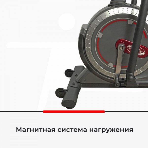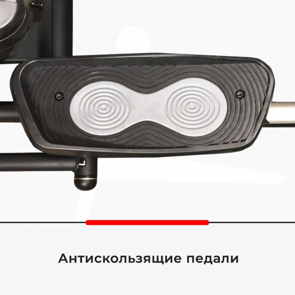 Конструкция с магнитным сопротивлением предусматривает восемь уровней нагрузки (маховик 7 кг). Для проверки частоты пульса есть встроенные сенсоры на поручнях. Тренажер имеет удобные широкие педали с антискользящей поверхностью. Длина шага 41 см.