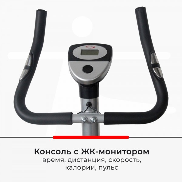 Модель предлагает выбор из восьми уровней сопротивления. Комфортное седло регулируется по высоте, на педалях расположены ремешки для фиксации ног. Частоту работы сердца проверят датчики на руле.