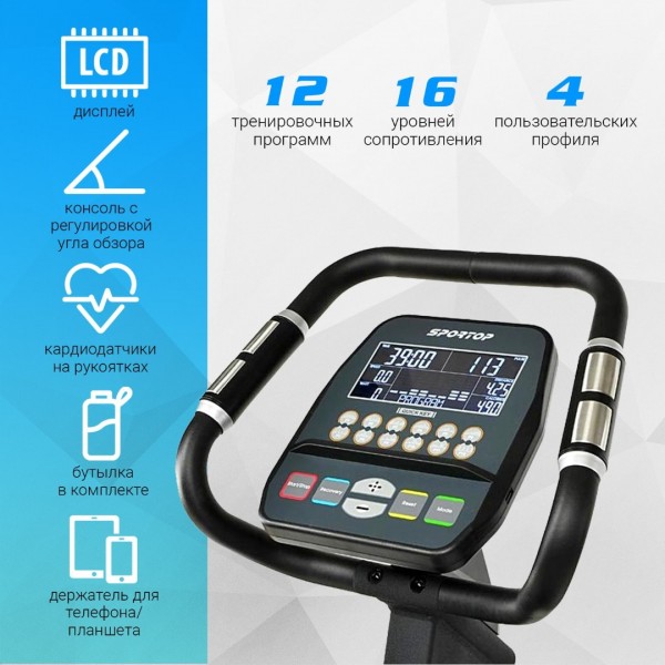 Поручни с мультихватом, вокруг консоли встроены сенсоры проверки пульса. Бутылка для воды в комплекте.