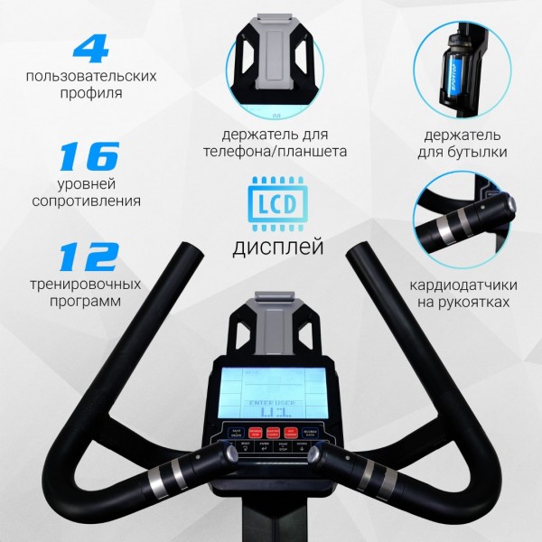 Тренажер позволяет точно настроить уровень сопротивления в Ваттах (эргометр). Сидение настраивается в двух плоскостях. Установлен сбалансированный маховик, педали расположены с интервалом 18 см. Педали имеют ремешки для фиксации, на поручнях расположены датчики проверки пульса.