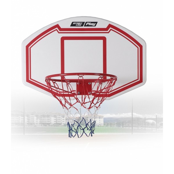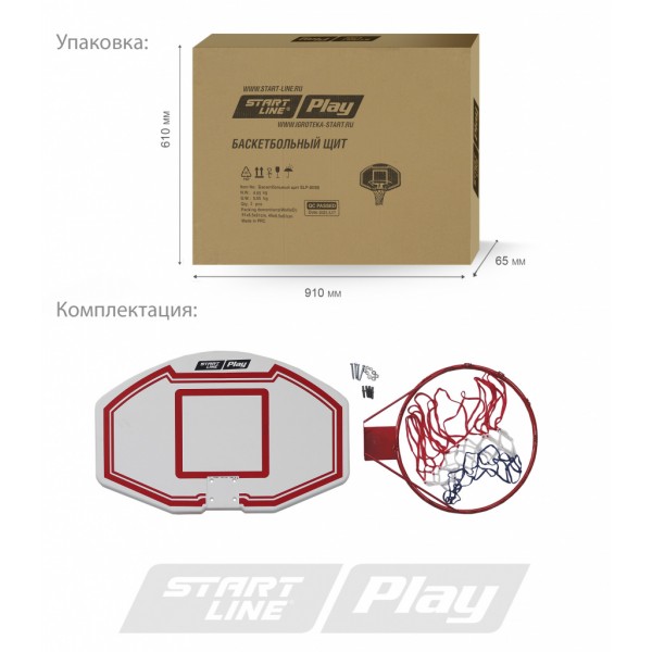 Щит Start Line 005B выполнен из современных материалов, кронштейн для крепления металлический. Баскетбольная корзина в комплекте.