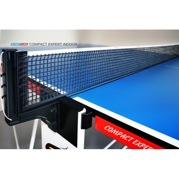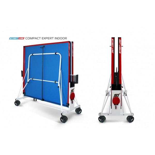 Стол Start Line Compact Expert Indoor предлагает современную систему трансформации для установки в помещении. Сложить стол легко может один человек, установлены удобные колеса для перемещения. Встроенная сетка имеет систему натяжения. Есть место для хранения ракеток.