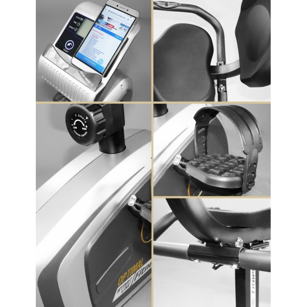 Модель имеет восемь уровней магнитной нагрузки. Кресло регулируется в горизонтальной плоскости, в зависимости от роста пользователя. В поручни встроены датчики для проверки пульса.