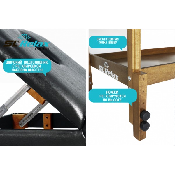 Профессиональное оборудование гарантирует комфорт клиента в течение сеанса. Предусмотрена настройка высоты, наклона подголовника, есть вырез для лица. На ножках сделана полка для аксессуаров массажиста.